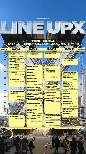 11:00 House Open [Quarter Final] Hiphop Waacking Open Style [Performance Competition] 16:00 Performance Competition Door Open 17:00 Event Start (Judge Show) 17:30 Youth Dept 18:30 Adult Dept 21:00 Tagg Showcase Award 22:00 After Party